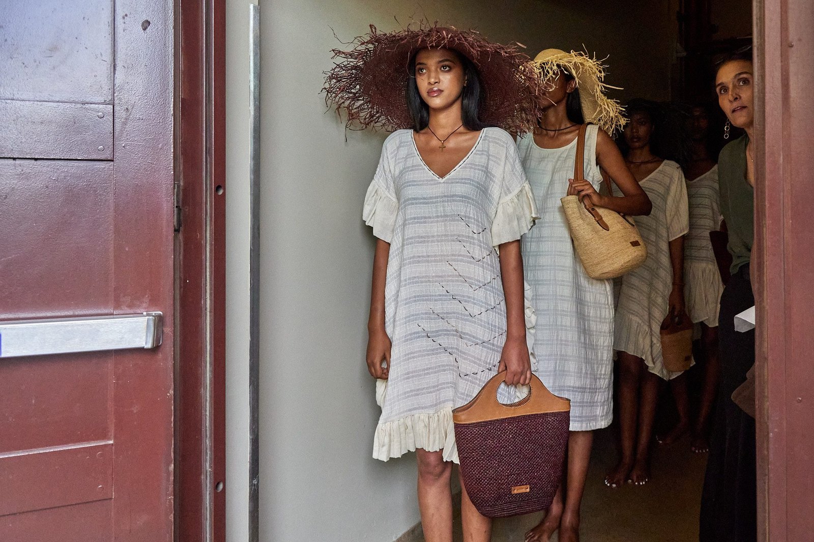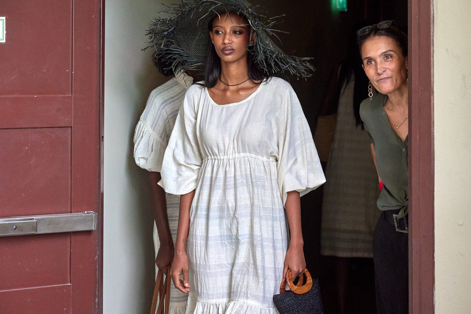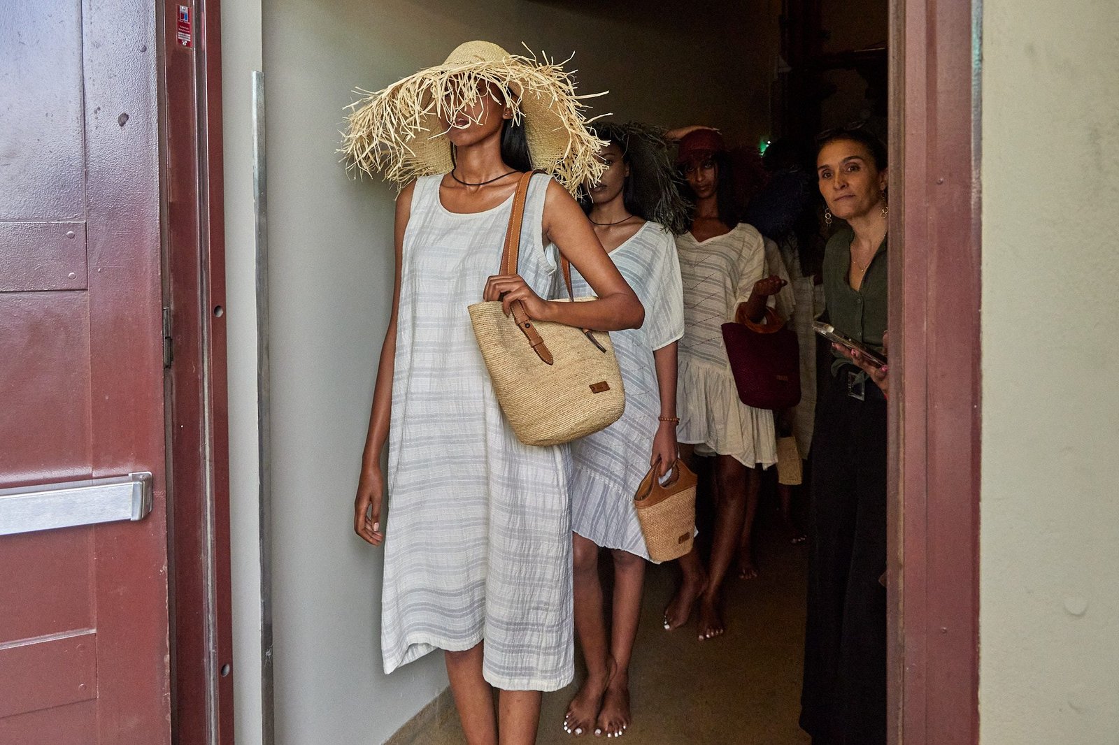 Backstage, models waited in a narrow passage. Light fell from the doorway. A quick check on bags, hats, and timing. A door opened, and the next look stepped forward.