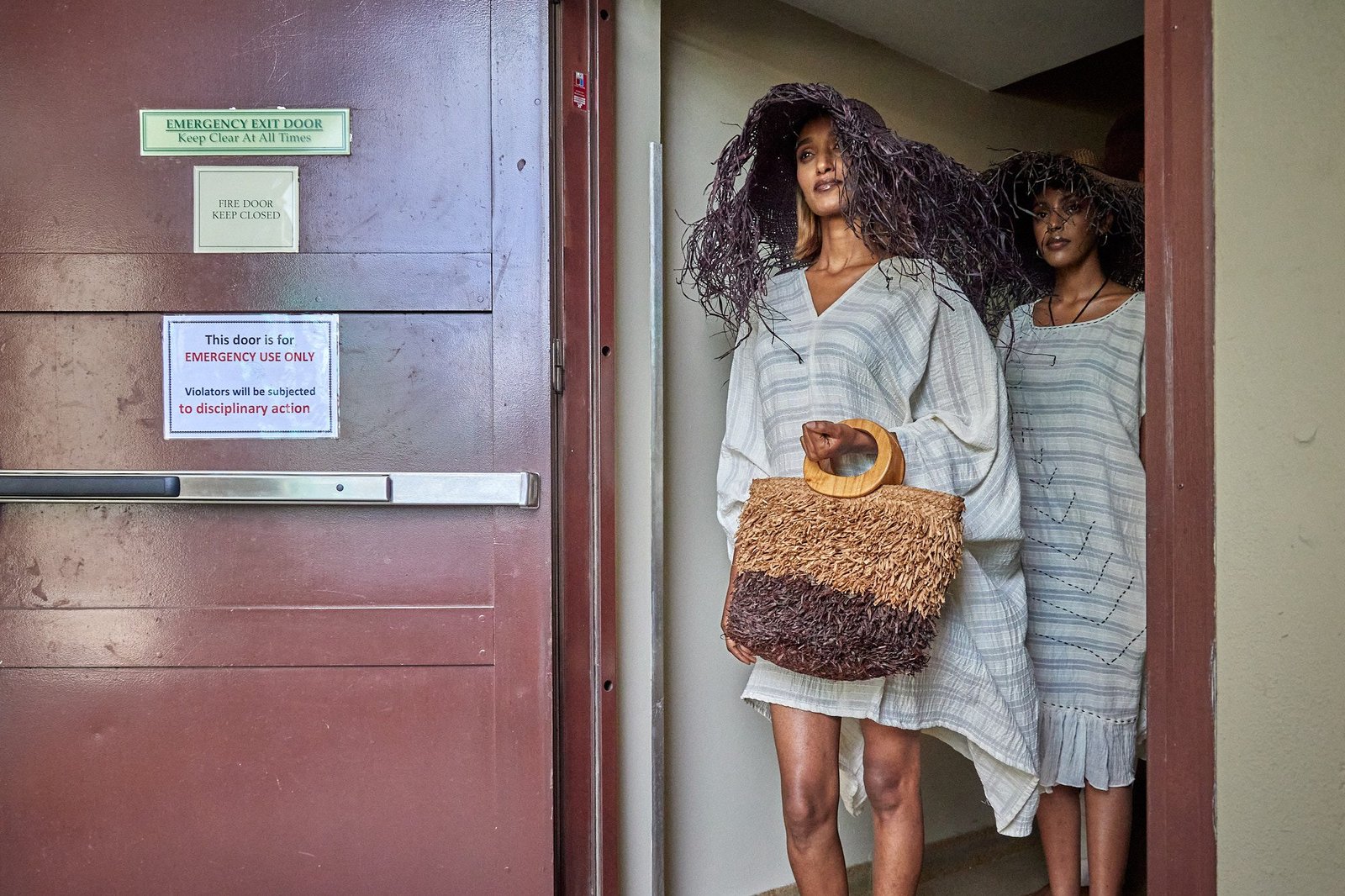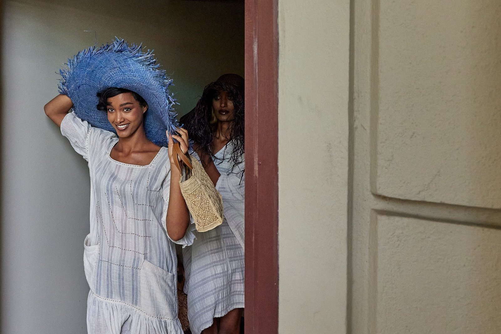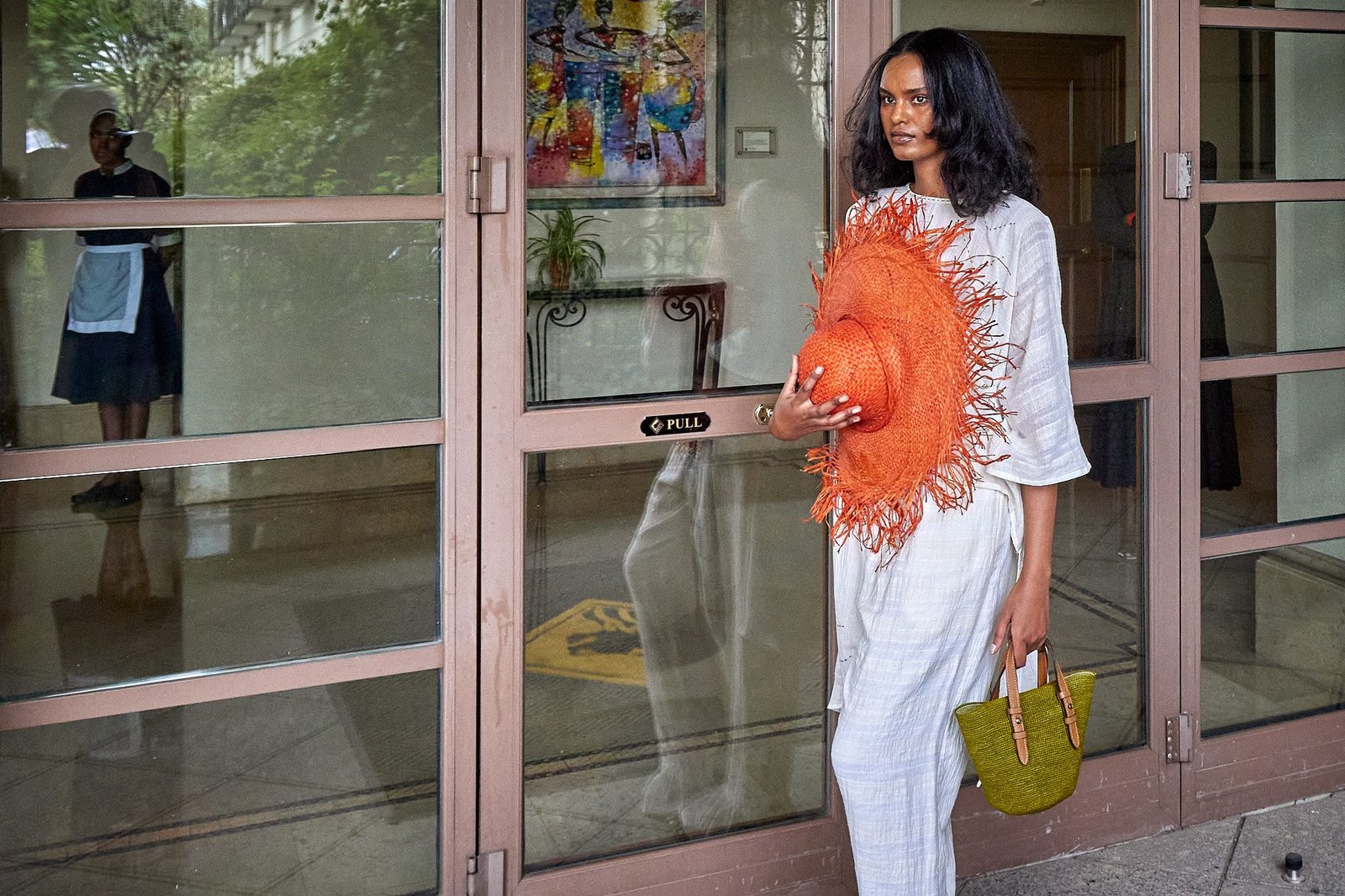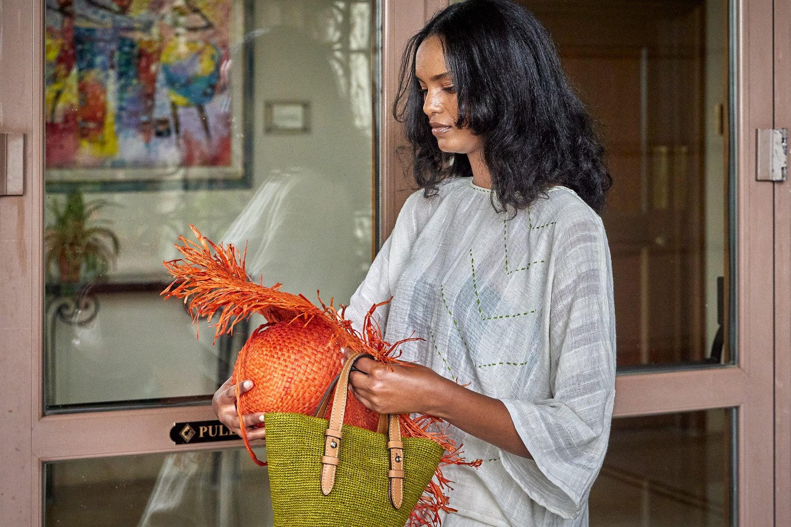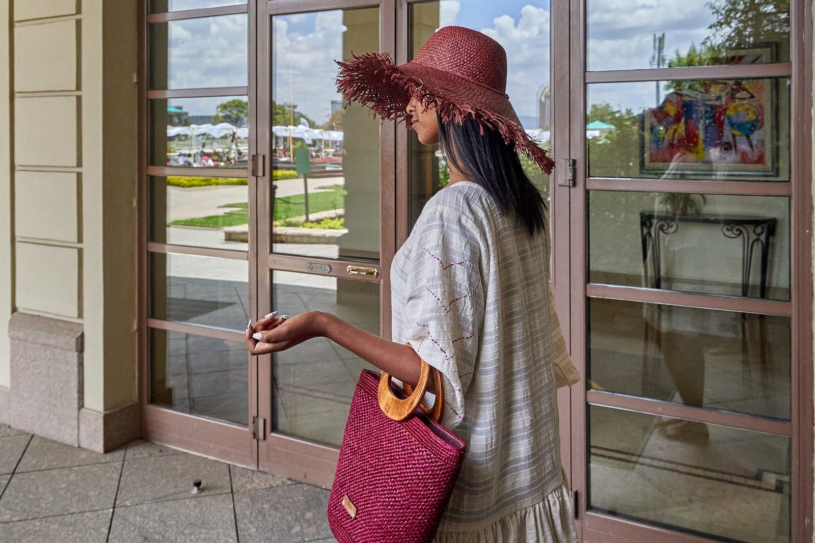 A wide-brim raffia hat set the tone. Raw edges moved with each step. The hat paired with a raffia bag, light in hand, firm in shape, finished with leather handles and a small label.