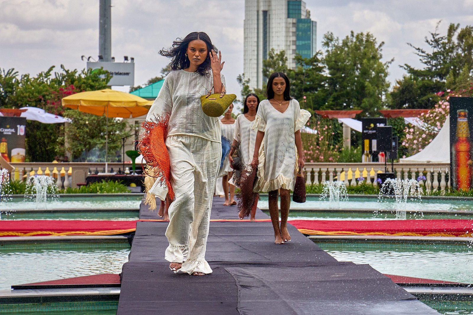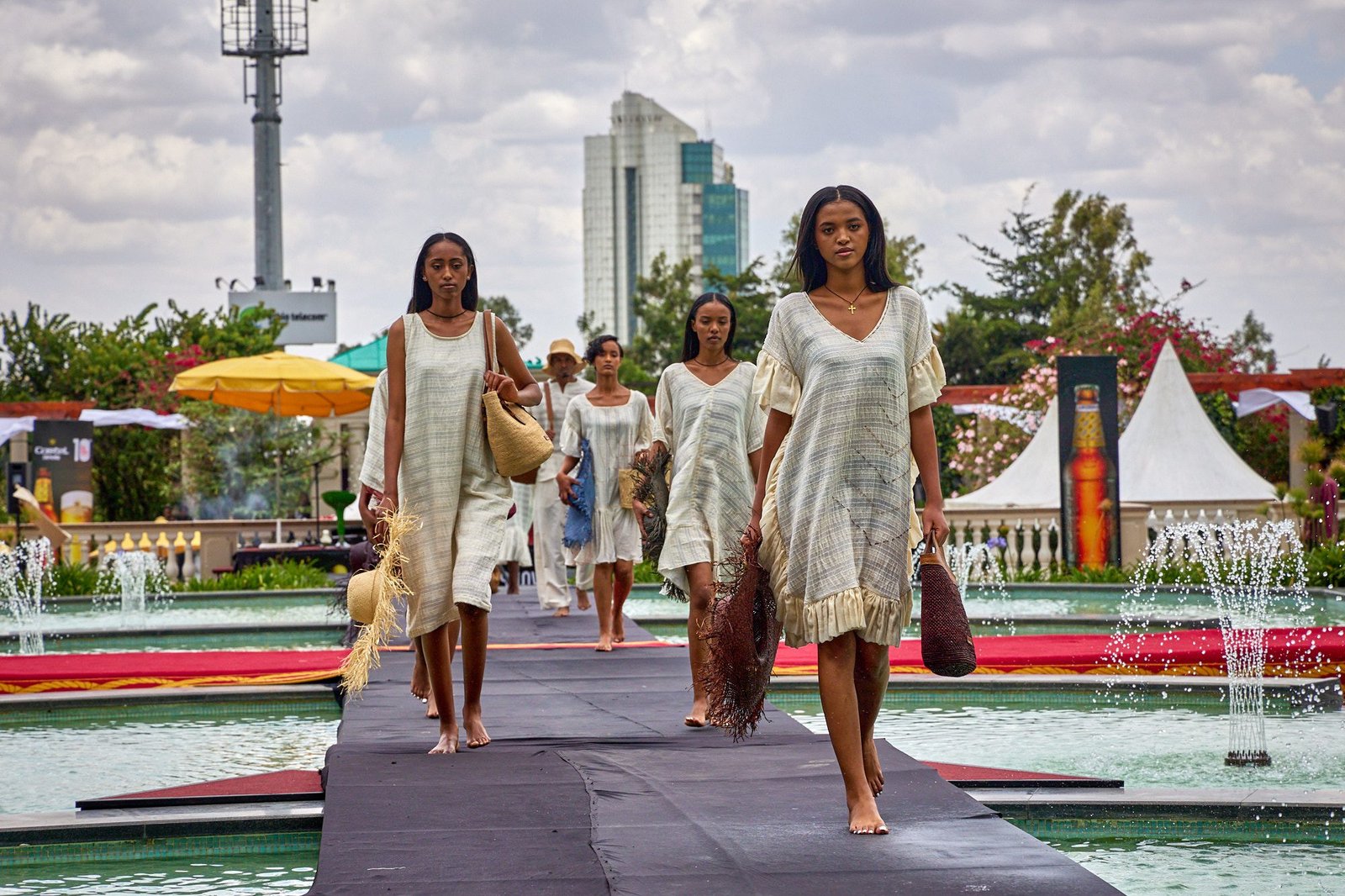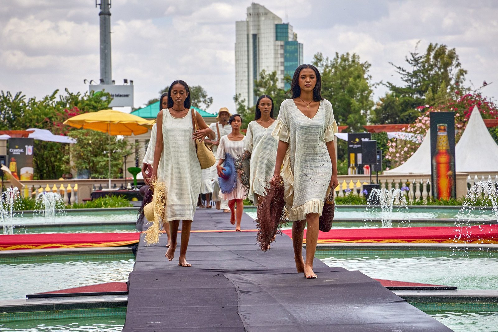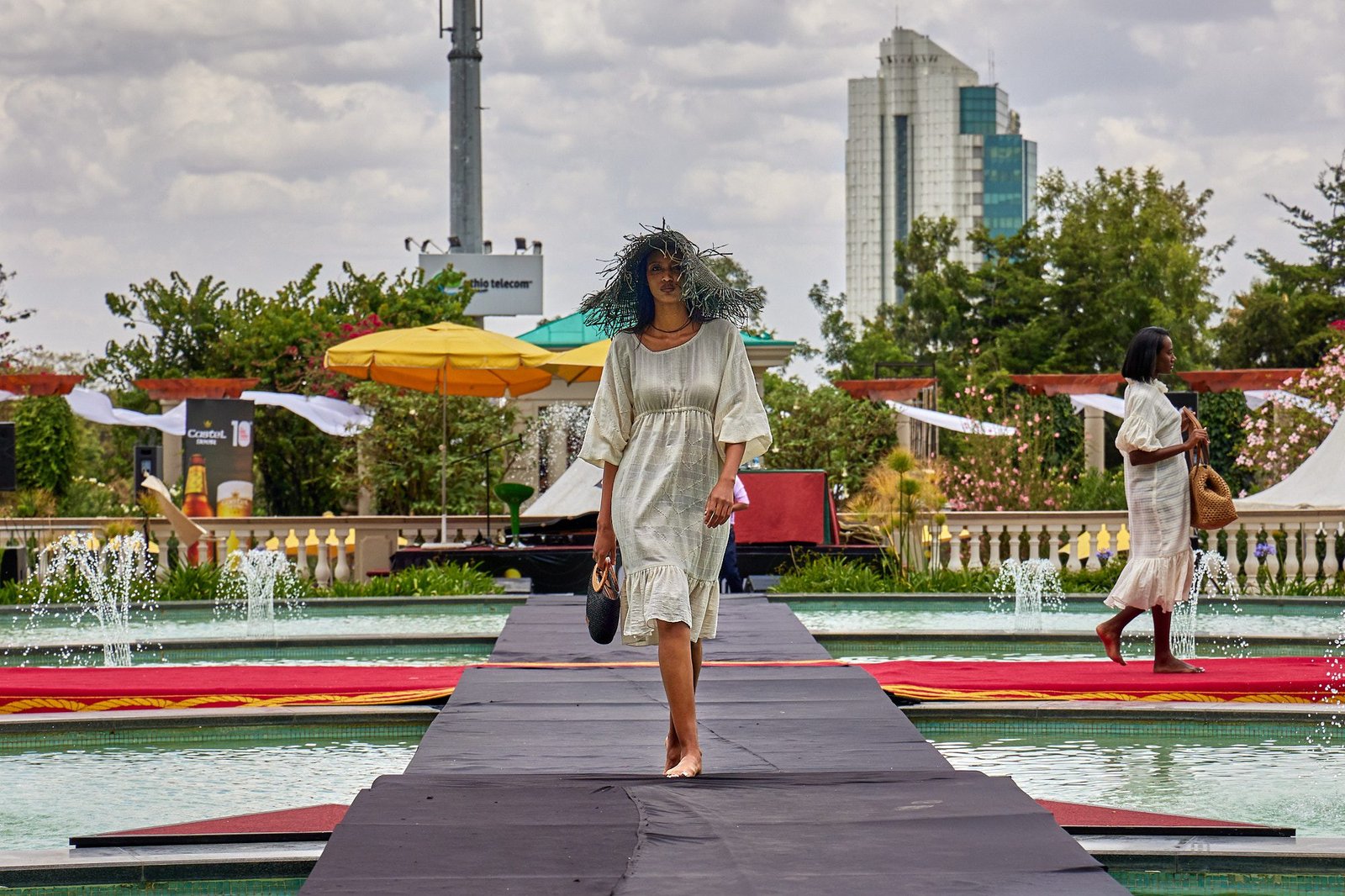 Addis Ababa – The runway crossed the Sheraton courtyard pool. Water and fountains framed the walk. Guests gathered along the edge, close enough to see texture and finishing work.