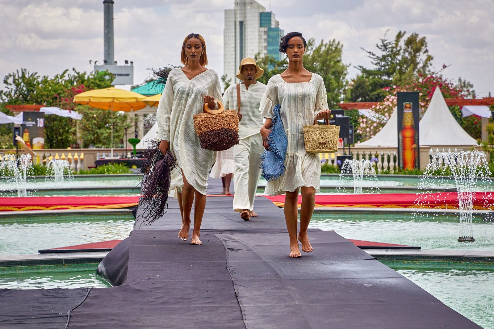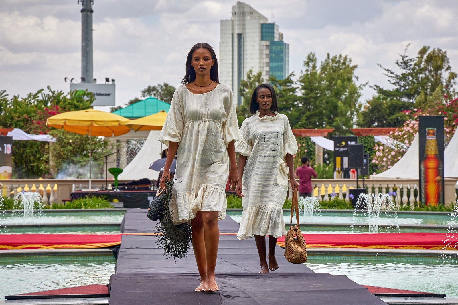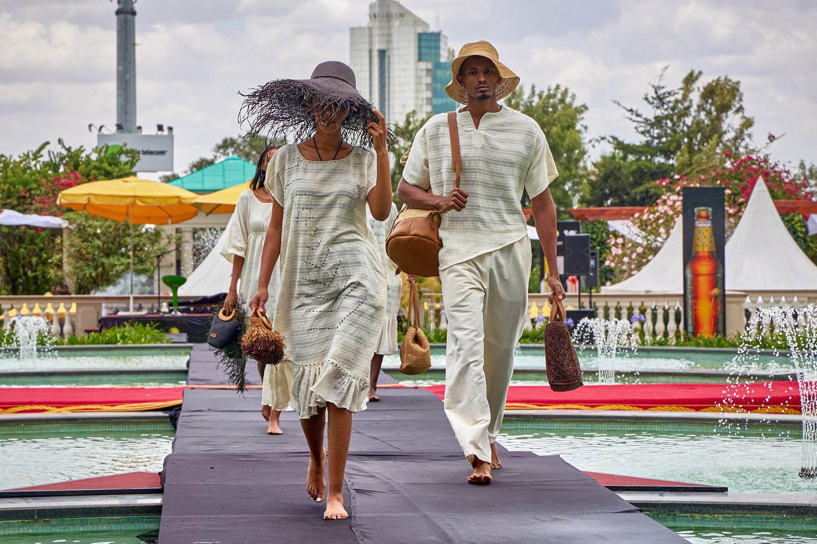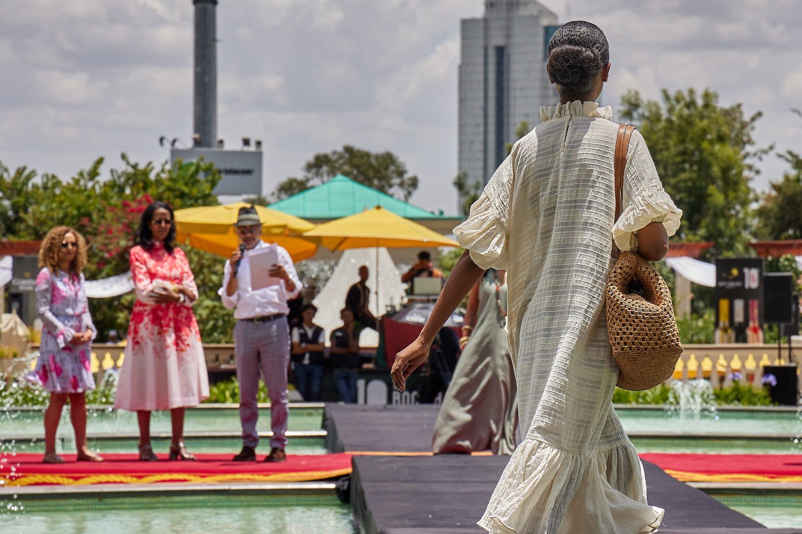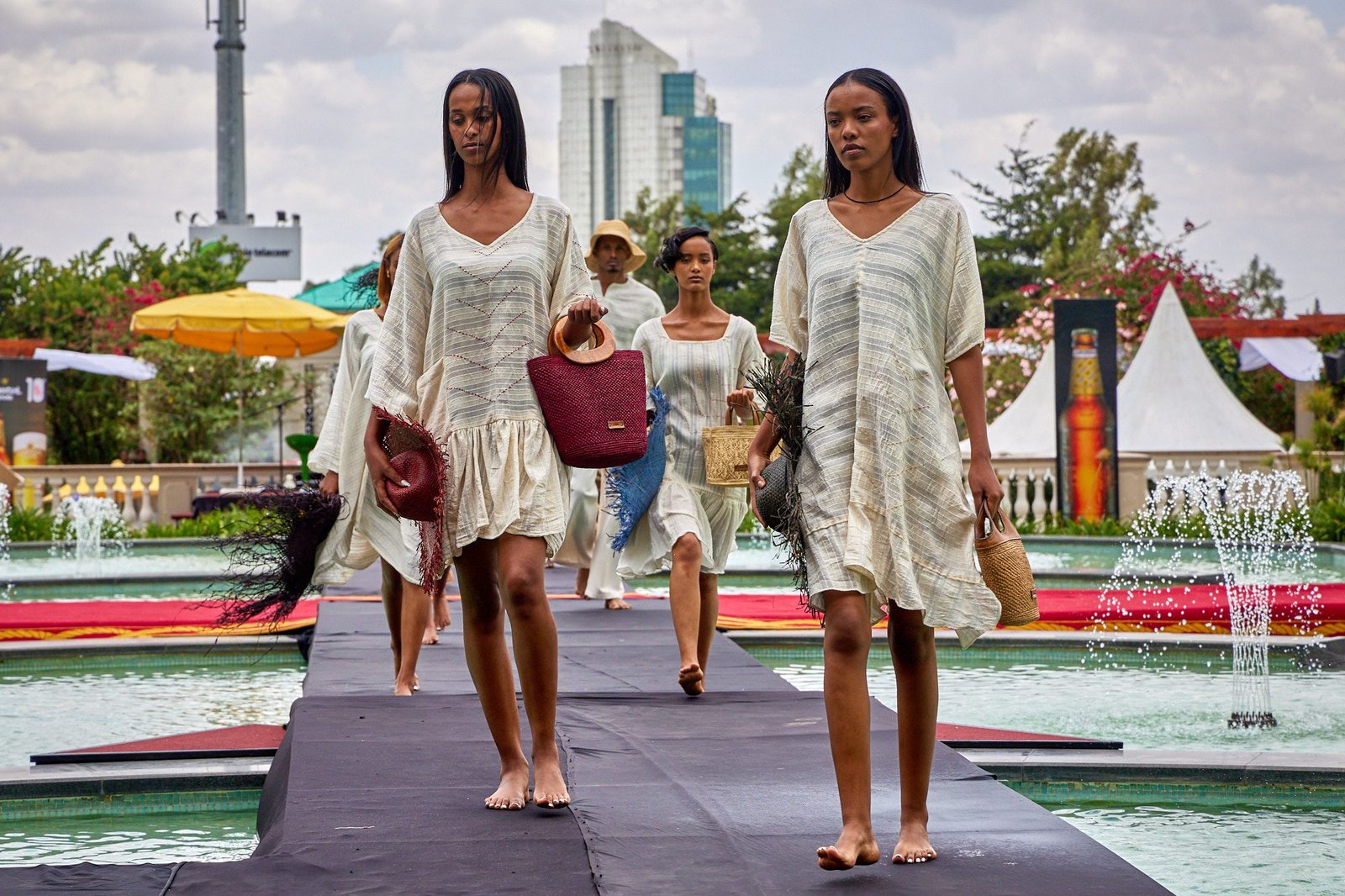 Addis Ababa – The runway crossed the Sheraton courtyard pool. Water and fountains framed the walk. Guests gathered along the edge, close enough to see texture and finishing work.