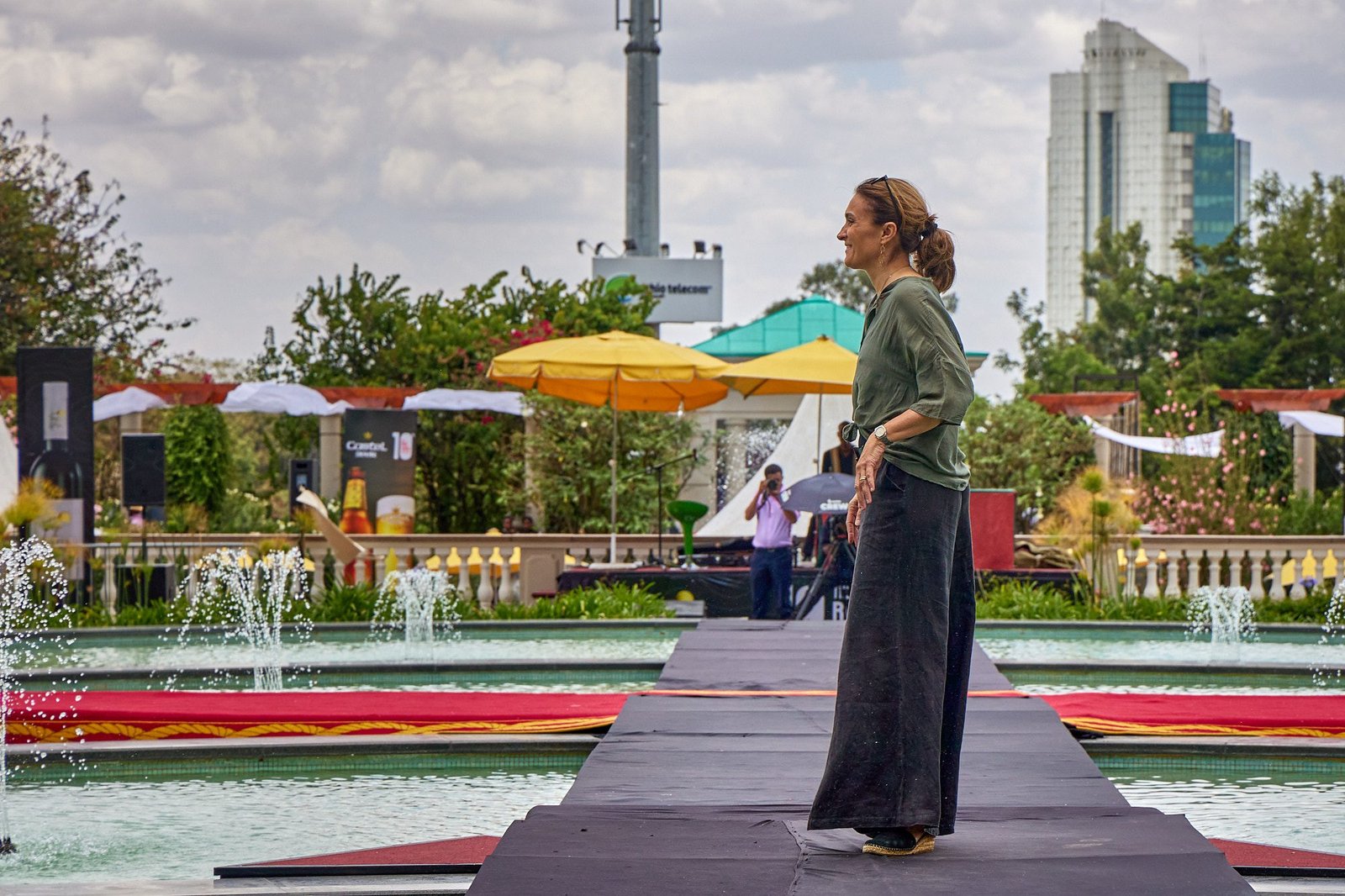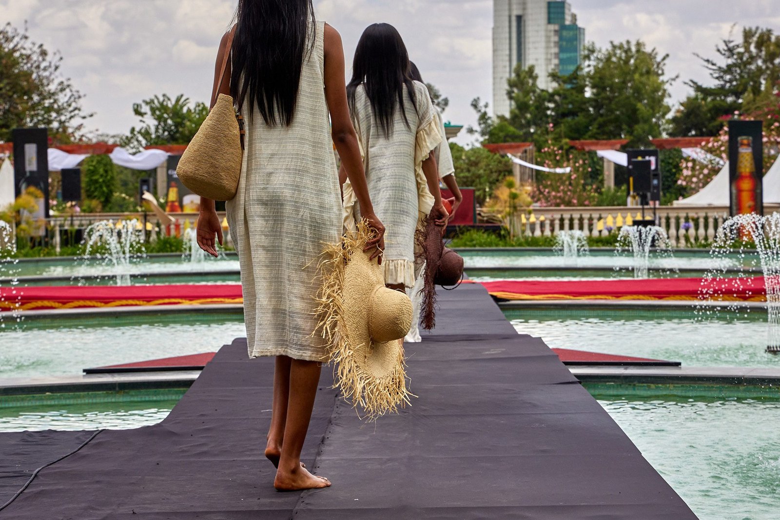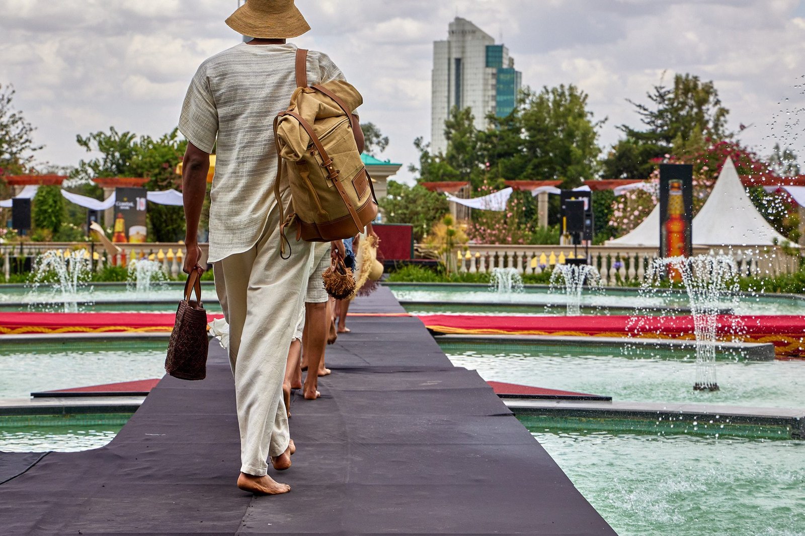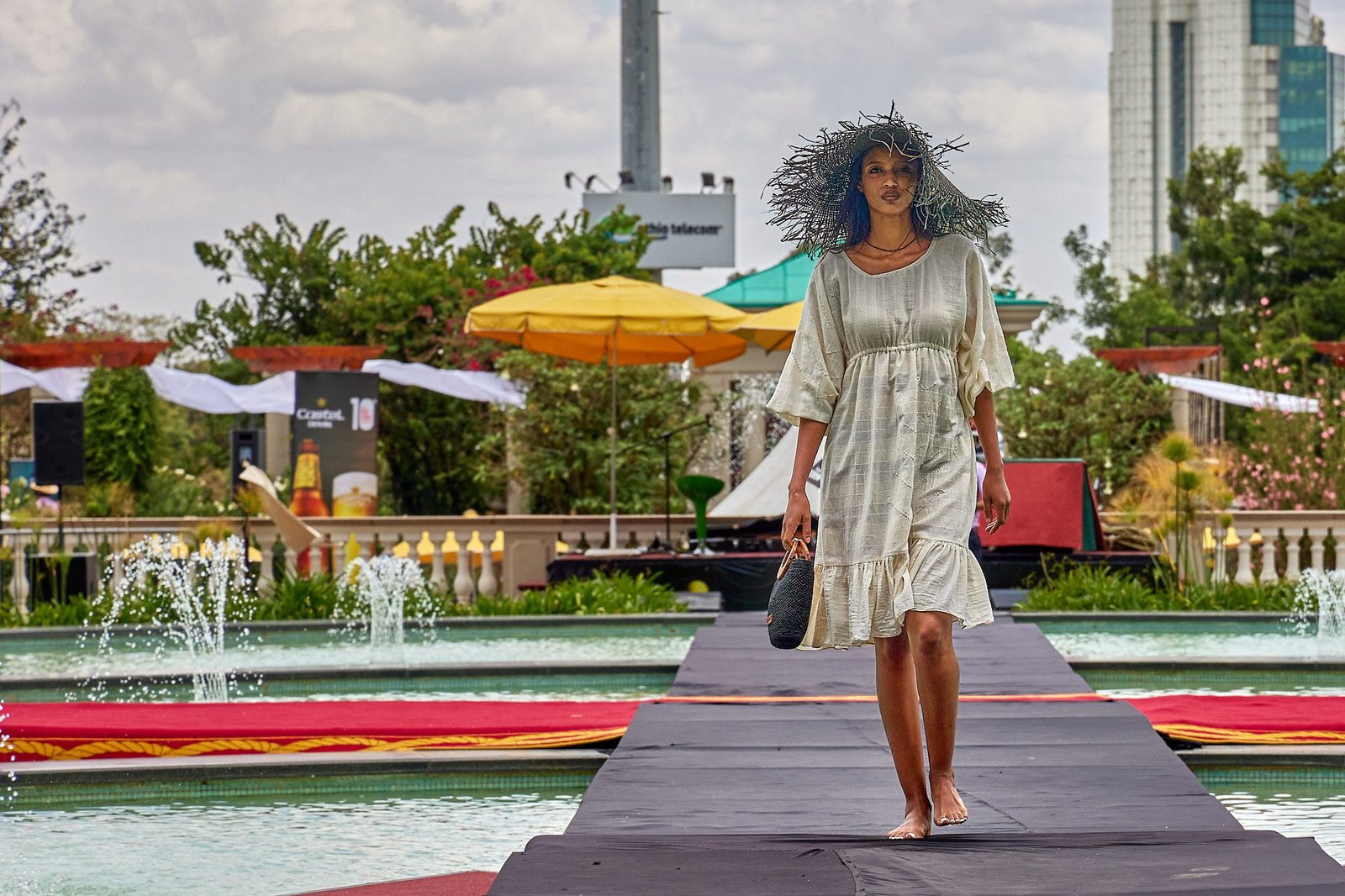 Addis Ababa – The runway crossed the Sheraton courtyard pool. Water and fountains framed the walk. Guests gathered along the edge, close enough to see texture and finishing work.